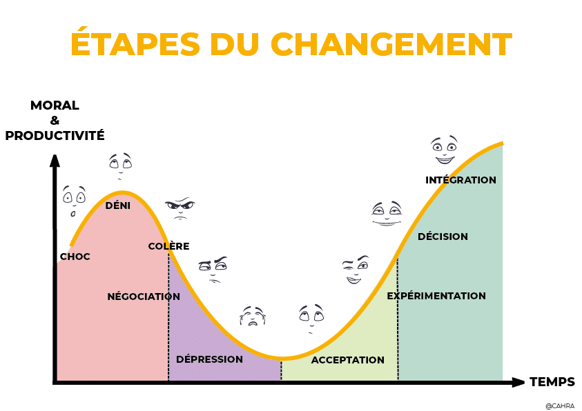 Il est donc hyper important de connaitre les étapes de ce changement de mental pour gérer et faire accepter le « bouleversement » perçu!